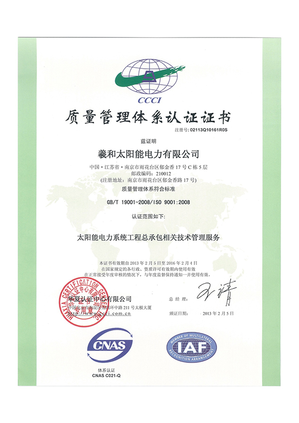 2013年新春伊始,羲和太陽能電力有限公司喜獲華夏認證中心頒發(fā)的ISO9001質(zhì)量管理體系認證證書。