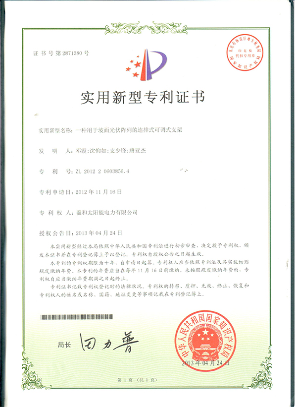 羲和太陽能電力有限公司的第一項專利“一種用于坡面光伏陣列的連排式可調節(jié)支架”(專利號:ZL201220603856.4)近日喜獲授權。此項實用新型專利技術針對坡面光伏陣列安裝,提供了一種新型、優(yōu)化的連排式支架方案,可有效節(jié)約土建成本,縮短安裝工期,調節(jié)角度便利,并增強系統(tǒng)抗風性能。