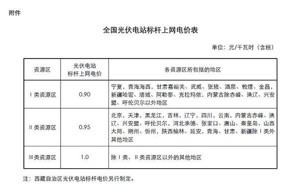 (一)根據(jù)各地太陽能資源條件和建設(shè)成本,將全國分為三類太陽能資源區(qū),相應(yīng)制定光伏電站標桿上網(wǎng)電價。各資源區(qū)光伏電站標桿上網(wǎng)電價標準見附件。