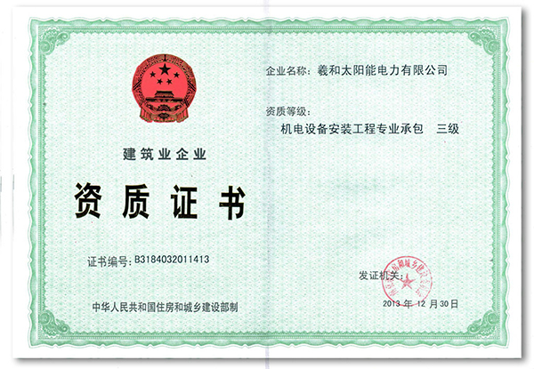 羲和太陽能喜獲機電設(shè)備安裝三級資質(zhì)