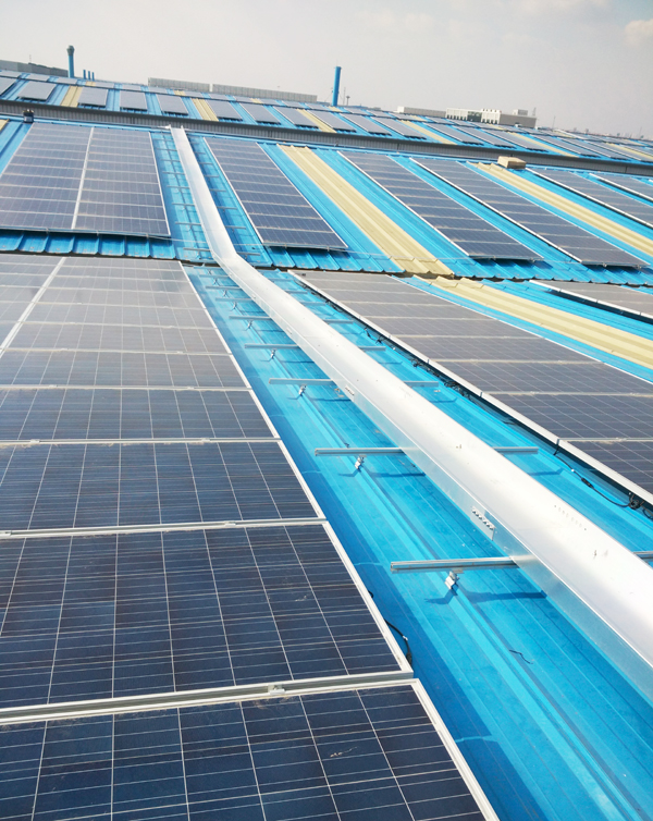 該項目位于江蘇省啟東市,利用企業(yè)廠房屋頂安裝光伏組件。因房屋荷載要求較高、廠區(qū)原水泥地坪不允許破壞、廠區(qū)消防要求較高、地下管網(wǎng)比較復雜等諸多建設(shè)條件限制,在組件、逆變器、升壓變、開關(guān)站等設(shè)備安裝布置及電纜敷設(shè)路徑等關(guān)鍵問題上進行了多次設(shè)計、施工方案討論,克服了諸多困難,是屋頂分布式光伏電站的經(jīng)典之作。
