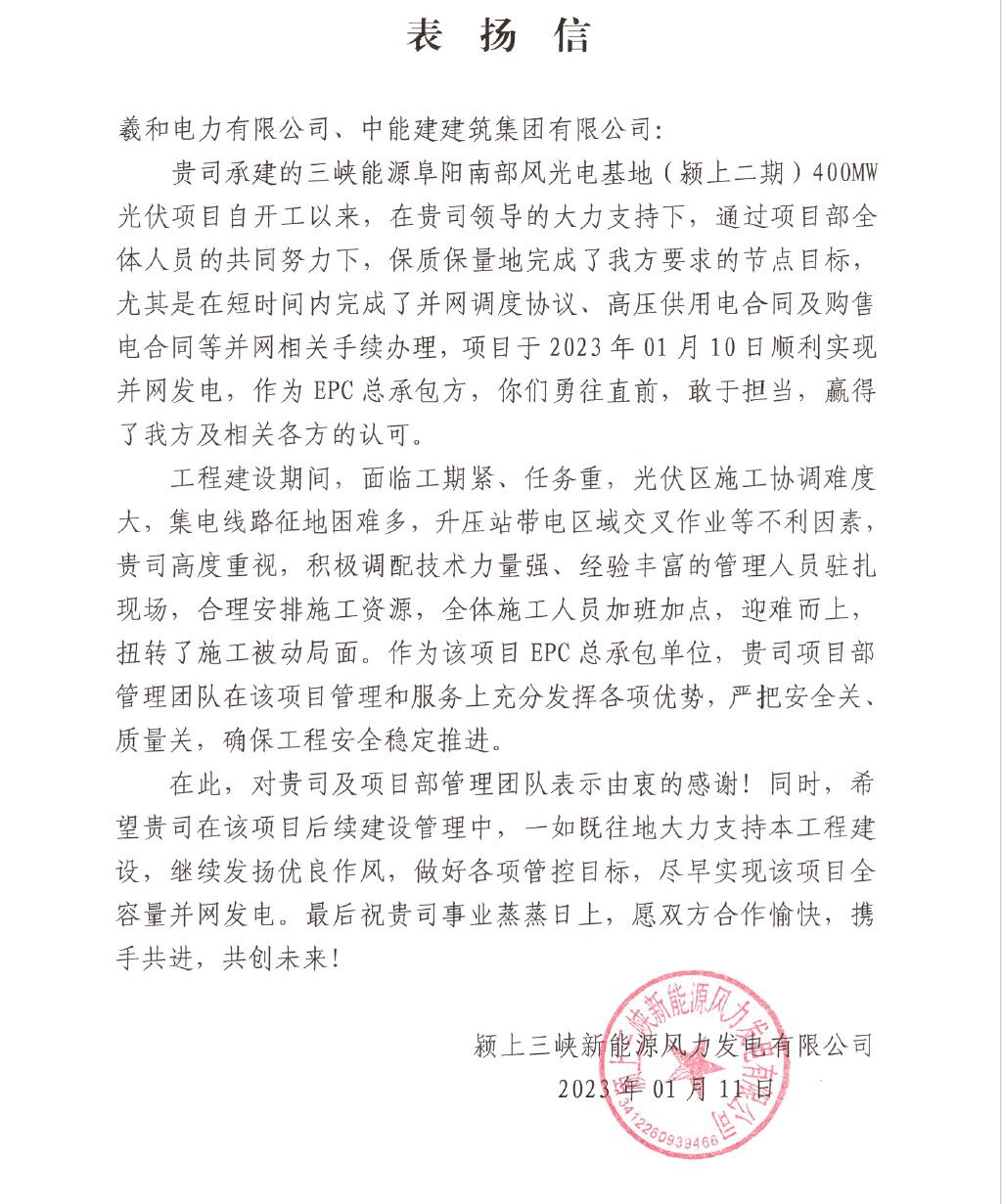為確保首批并網(wǎng)的順利完成,在公司領(lǐng)導(dǎo)以及三峽業(yè)主和監(jiān)理的大力支持下,項(xiàng)目部全體成員鼓足干勁。項(xiàng)目于2022年12月11日升壓站電氣設(shè)備開始陸續(xù)進(jìn)場,其中2臺主變、4個GIS間隔、4臺SVG、4臺接地變、31面35kV開關(guān)柜、41面二次屏柜,1臺站用變,歷時26天,于2023年1月9日完成倒送電、2023年1月10日正式并網(wǎng)發(fā)電,體現(xiàn)了我司敢打硬仗、能打贏仗的精神,得到了建設(shè)方和監(jiān)理方的高度肯定。